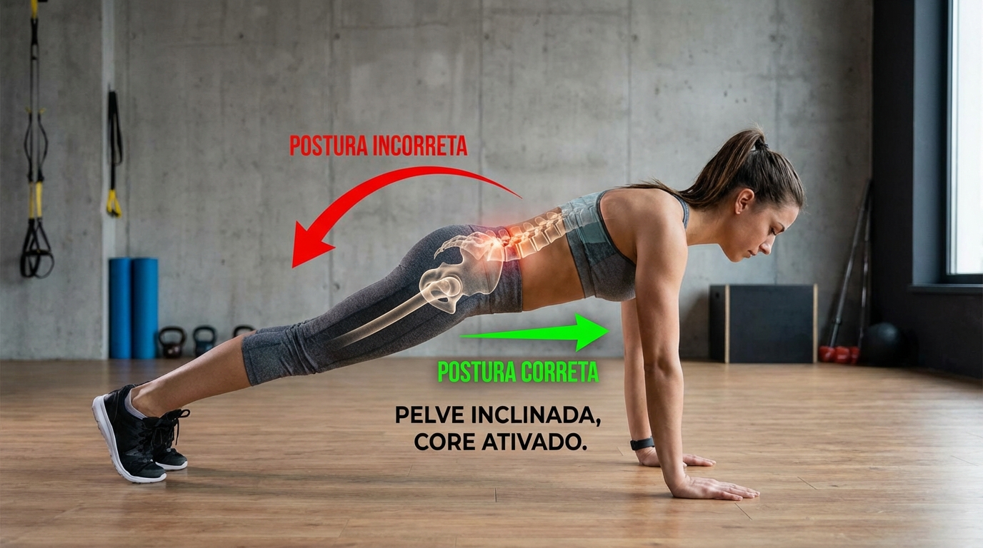 Elimine dor lombar na prancha! Descubra o erro crucial de postura e ative seu core corretamente. Fortaleça seu abdômen com segurança e eficiência.