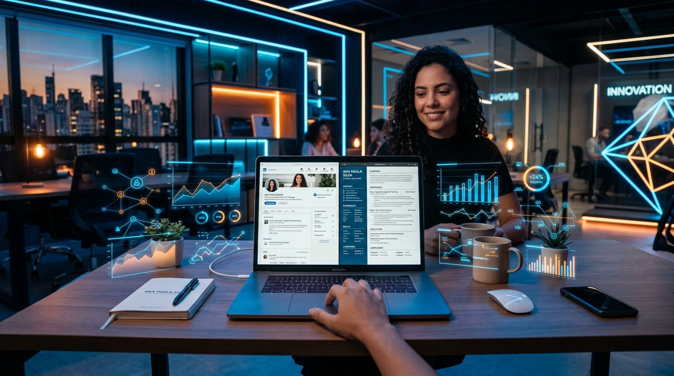 - Mapeamento de Keywords: Identifique as 10 palavras-chave mais quentes da sua área. No LinkedIn, espalhe-as no título, sobre e competências. No currículo, foque-as na seção de experiências e resumo técnico.