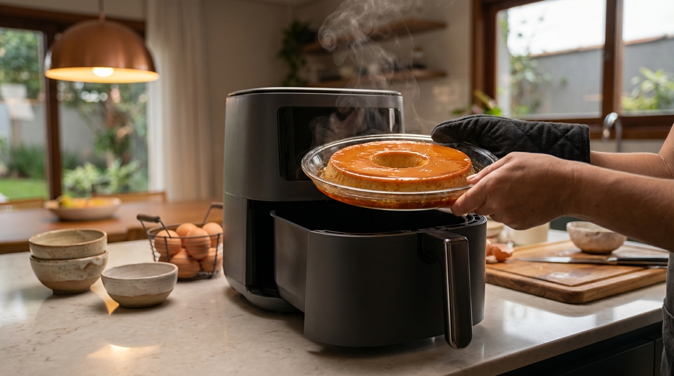 Muitos cometem o erro de colocar a forma de pudim diretamente no cesto da airfryer. O resultado? Um doce queimado por cima e cru por dentro. Para dominar a técnica de banho-maria, siga estas instruções precisas que protegem a integridade da sua criação: