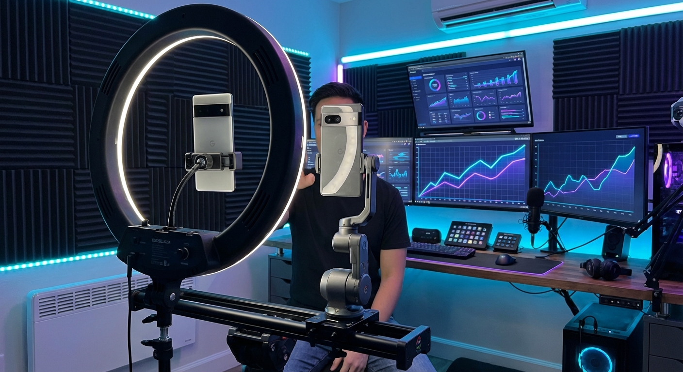 Invista em um microfone de lapela sem fio. É o melhor investimento de 200 reais que você fará na vida. Quanto à luz, a luz natural é ótima, mas se você quer o visual de Growth Hacker, use uma key light de 45 graus para criar profundidade no rosto.
