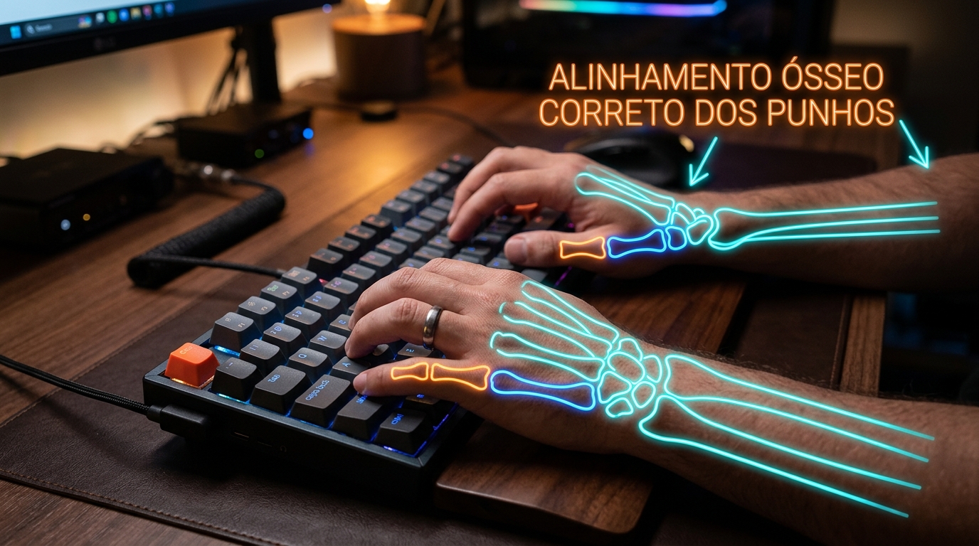 Descubra como a ergonomia de teclado e a posição neutra dos punhos previnem a Síndrome do Túnel do Carpo e evitam a degradação da sua produtividade digital.